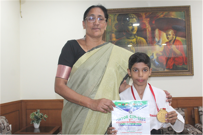 Anshuman Singh of class 6C was honoured with the medal and Certificate of Merit for achieving 1st Rank in Mayor Cup 2022. Mayor Cup 2022, 7th International Karate Championship was held at Jhapa, Nepal from 29 to 30 April, 2022 where participants from different countries showcased their talent. Anshuman Singh participated in  Kumite, weight category-  30 kg below. He not only made his school but also his country feel proud.