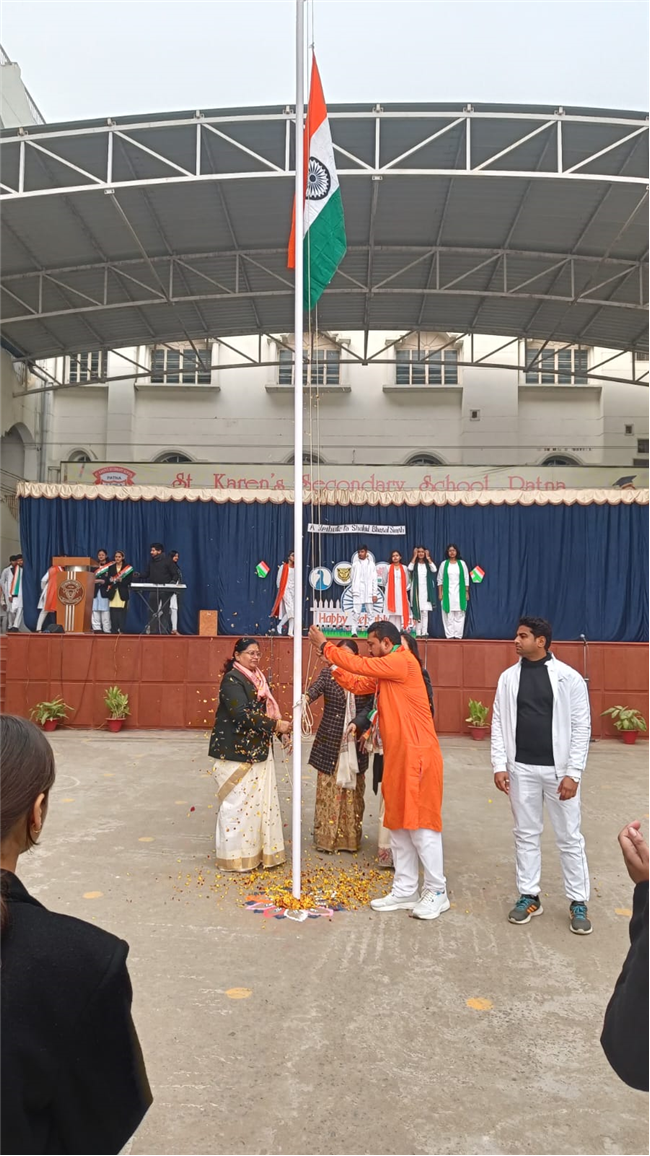 Description: St. Karen's Secondary School marked Republic Day with a vibrant celebration. The event commenced with the solemn flag hoisting ceremony, and the school choir eloquently presented the preamble, setting a patriotic tone. Following this, an enchanting medley captivated the audience. The festivities continued with a spectacular performance by students from Classes IX and XI, who showcased a mesmerizing dance drama depicting the inspiring life of Bhagat Singh. The audience was treated to a delightful fusion of artistic expression and historical storytelling. To conclude the celebration, a graceful dance performance added a touch of elegance, leaving everyone in awe of the talent displayed by the students.