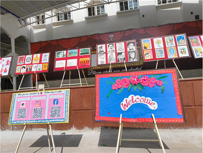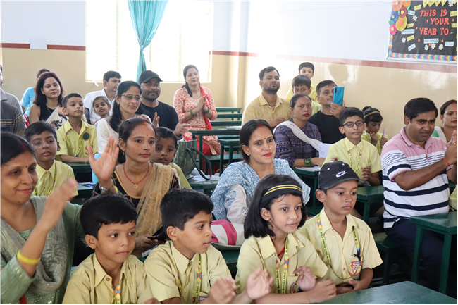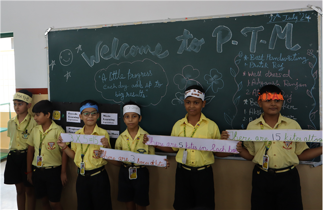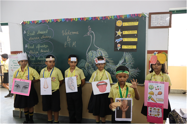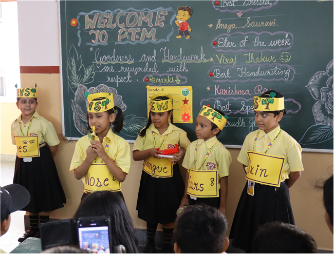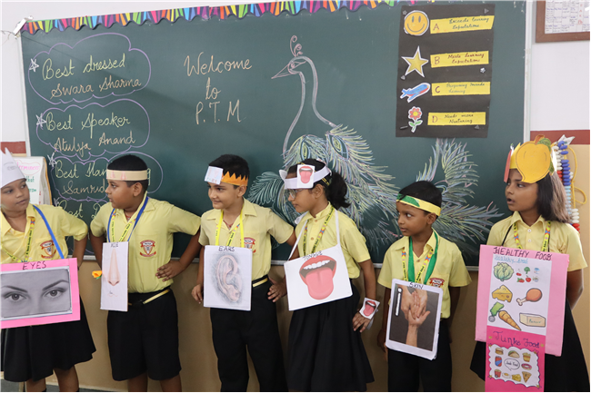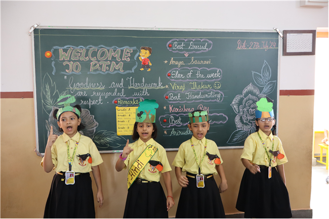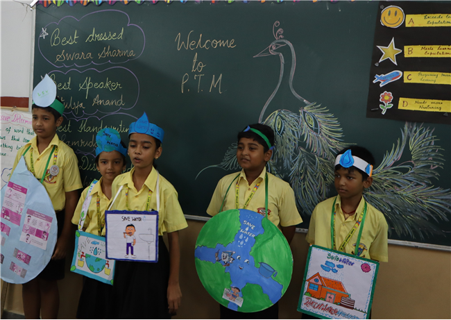 During today's PTM, students from different classes showcased their talents through engaging presentations. Students of Std 1 to 5 effectively presented on various topics relevant to their classes, such as Conversation, Poems, Grammar with Fun, Stories, Role Play, Theatre Reading, Quiz, and Cyber Security. Additionally, students from Std 3 to 10 raised awareness about the importance of avoiding plastic use through Nukkad Natak performances and promoted tree planting using flashcards and banners.