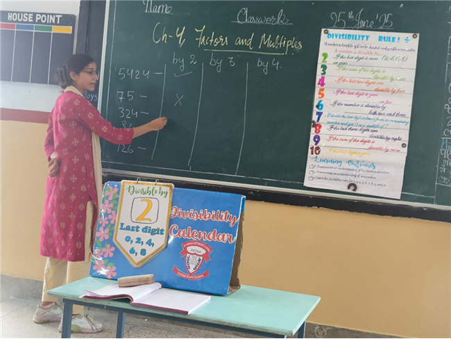 Date: 25th June 2025 Class: 5 B Subject: Mathematics Chapter: 4 – Factors and Multiples Topic: Divisibility Rules of 1, 2, 3, 4, 5, 6, 7, 8, 9, and 10 TLM: Divisibility Rules Calendar Teacher : Sumrita Kumari