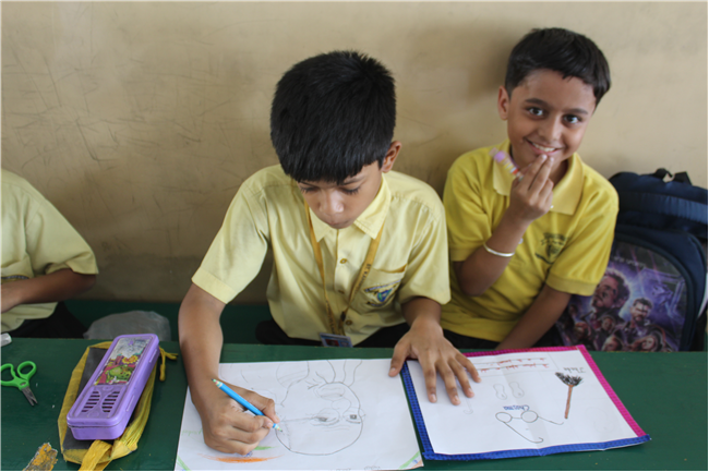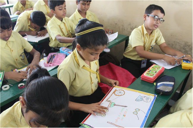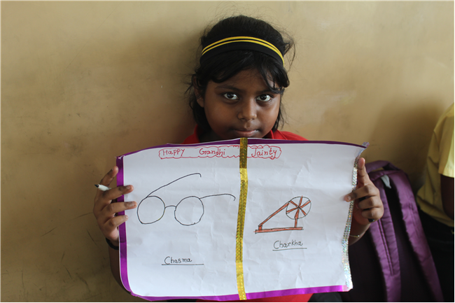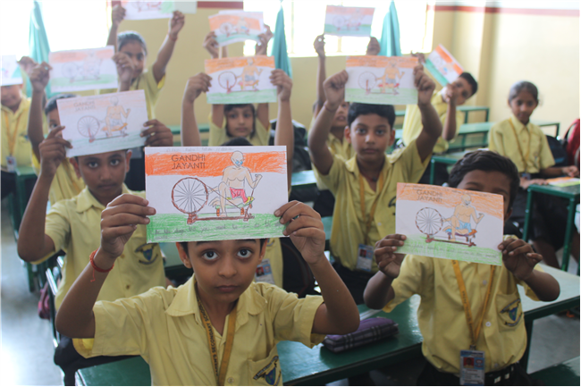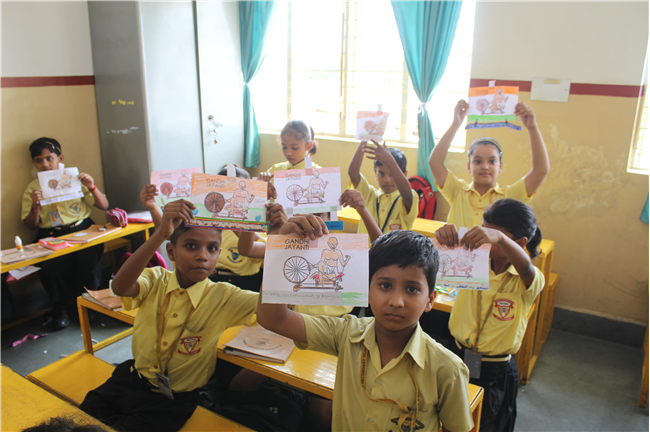 Std- 1 & 2 Colouring the sketch of Gandhiji with a slogan.