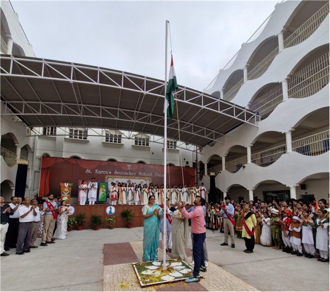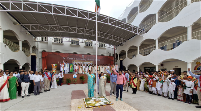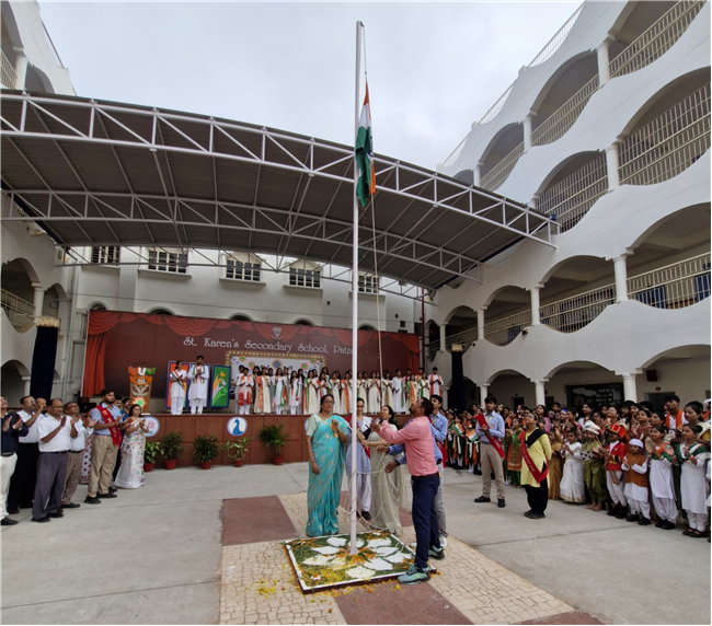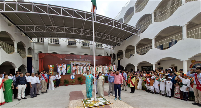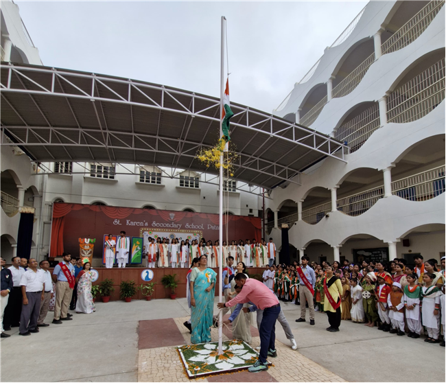 Description: The 78th Independence Day was celebrated with exceptional enthusiasm and fervour at St. Karen’s Secondary School, marking a significant moment in our nation's history. The day began with a solemn flag hoisting ceremony, which set the tone for the day's festivities. This was followed by vibrant group dances that showcased traditional and contemporary styles, adding a lively rhythm to the celebrations. Captivating speeches by dignitaries highlighted the nation's journey and achievements, offering both reflection and inspiration. Lively skit performed by dramatics club brought historical events and cultural values to life, engaging the audience in a creative and entertaining manner. The portrayal of various freedom fighters by primary students added a special touch to the day. Their heartfelt performances brought the bravery and dedication of the historical figures to life, providing a moving and educational experience for everyone present.Throughout the day, the spirit of unity and patriotism was palpable as people exchanged warm greetings and celebrated together. The combination of these events made the 78th Independence Day a memorable and significant occasion for all involved.