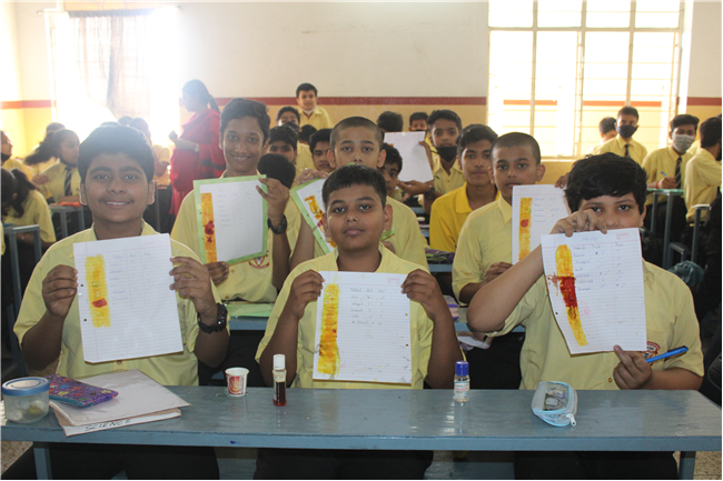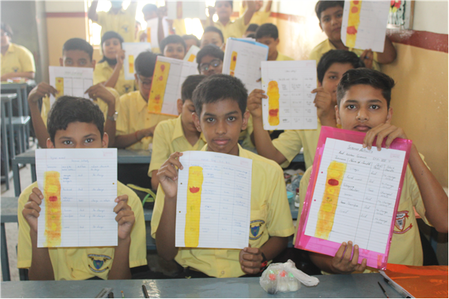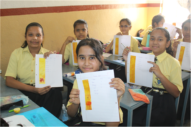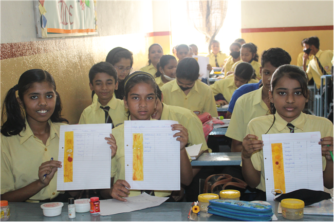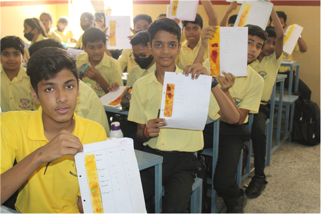 The students made turmeric paper and then tested Kitchen items like soap solutions, toothpaste, vinegar, milk, curd etc. and noted the change in colour.