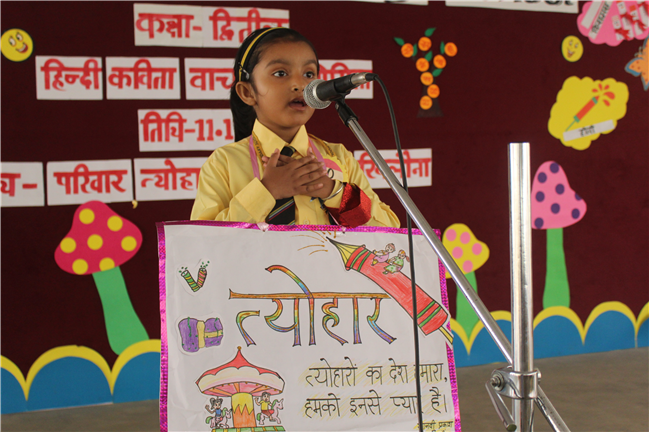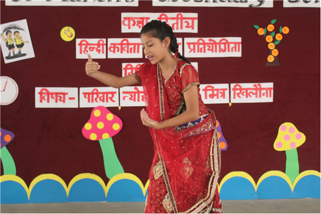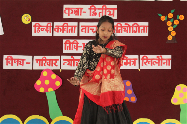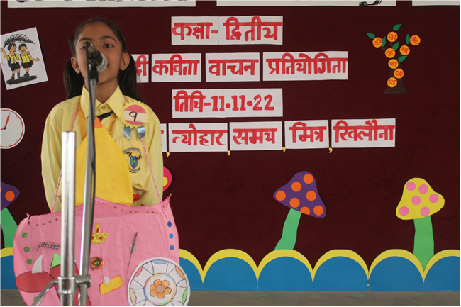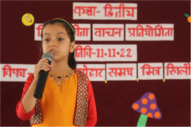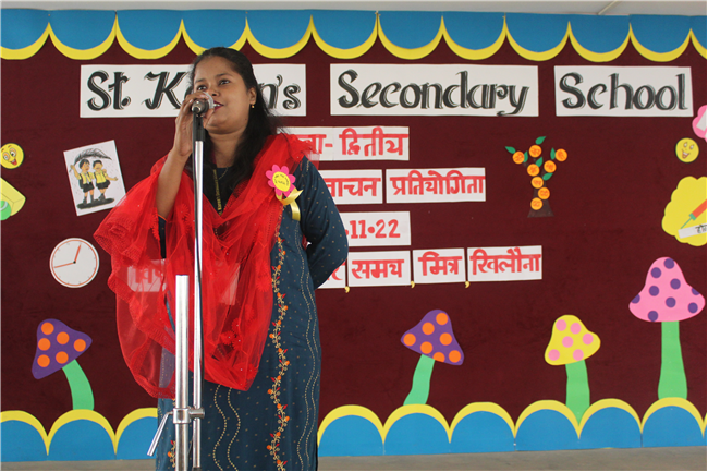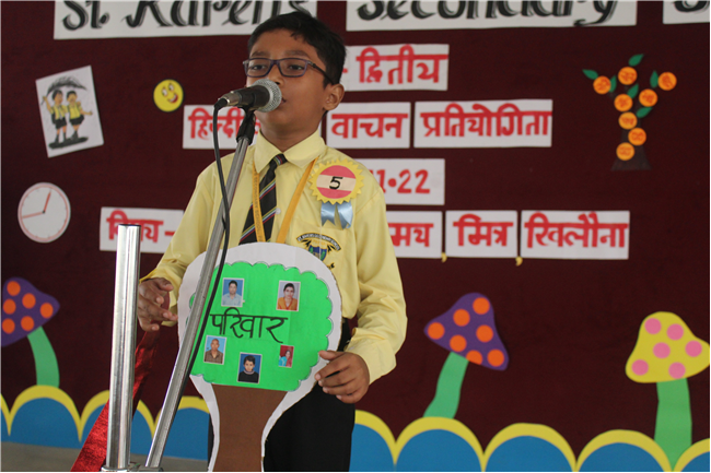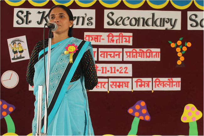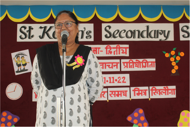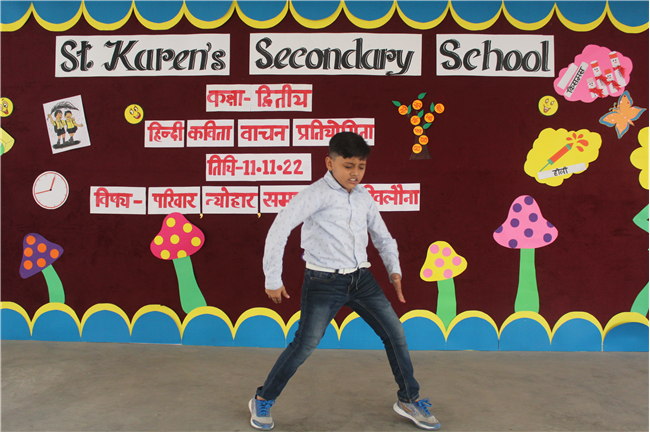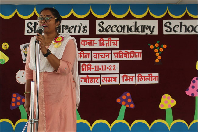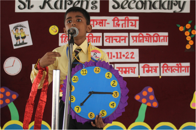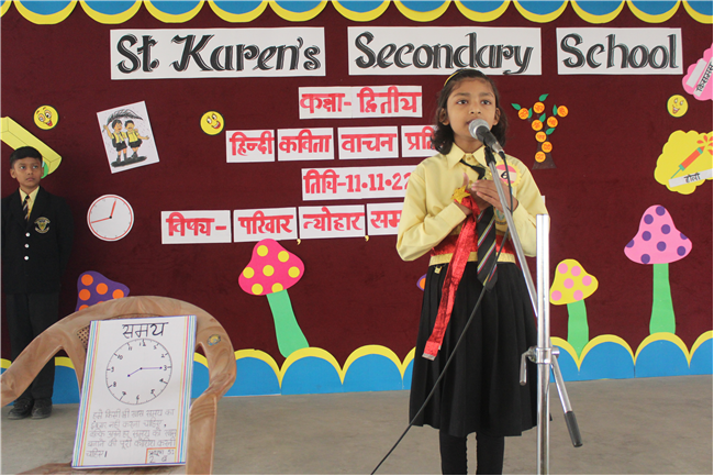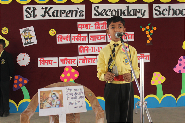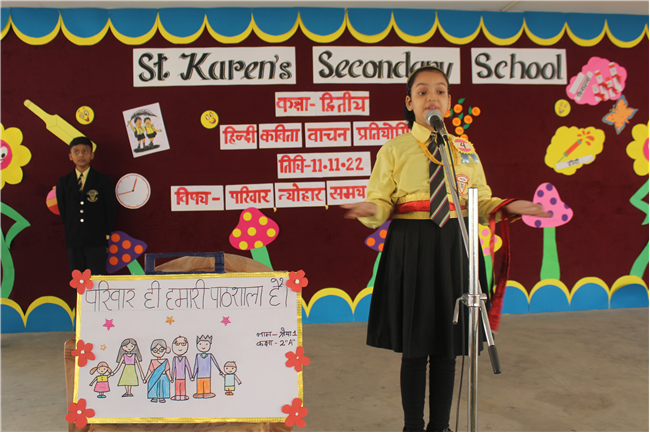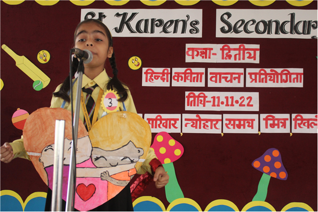 St.Karen's Secondary School primary wing has organised Hindi Recitation Competition on 11th November 2022 for Std. 2. This Competition was conducted just after the morning assembly. Final eight contestants (2 from each section) participated in this competition . Anchoring was done by Std.2 Students itself. Four fillers made this event more interesting and wonderful with their dance. All the performances done by the students were spectacular. They performed well . Winners were selected by three eminent judges. Overall today's competition was mesmerizing.