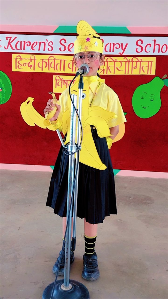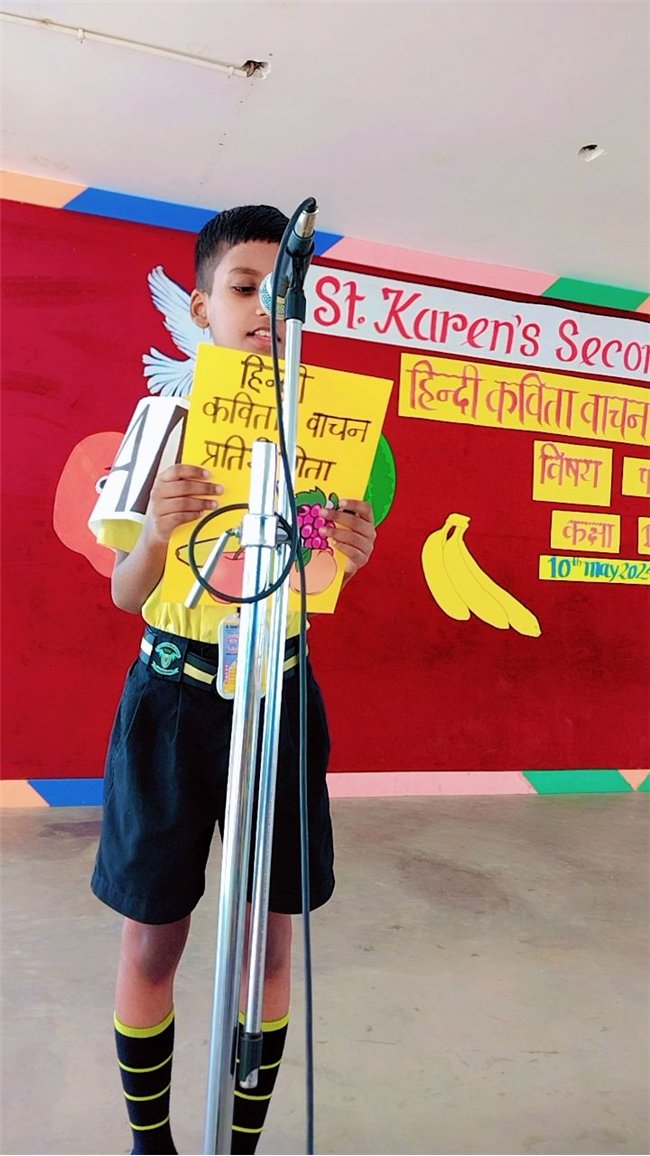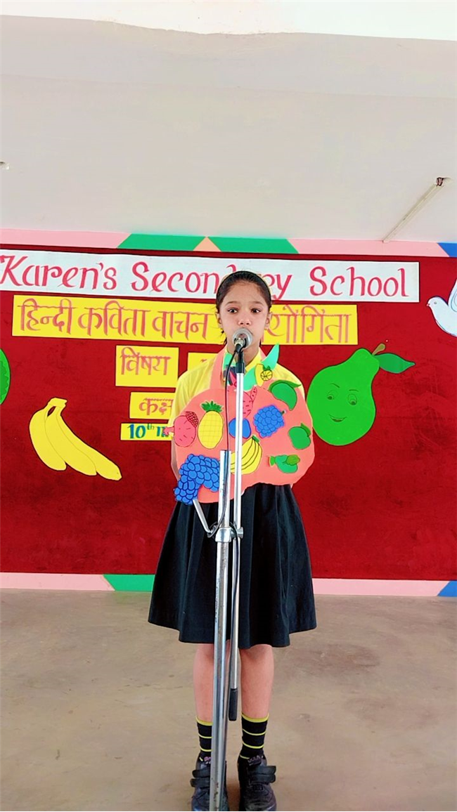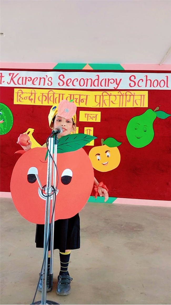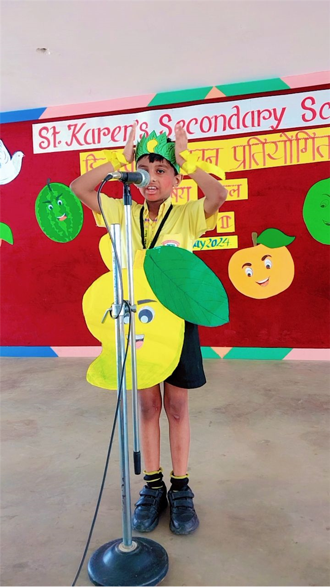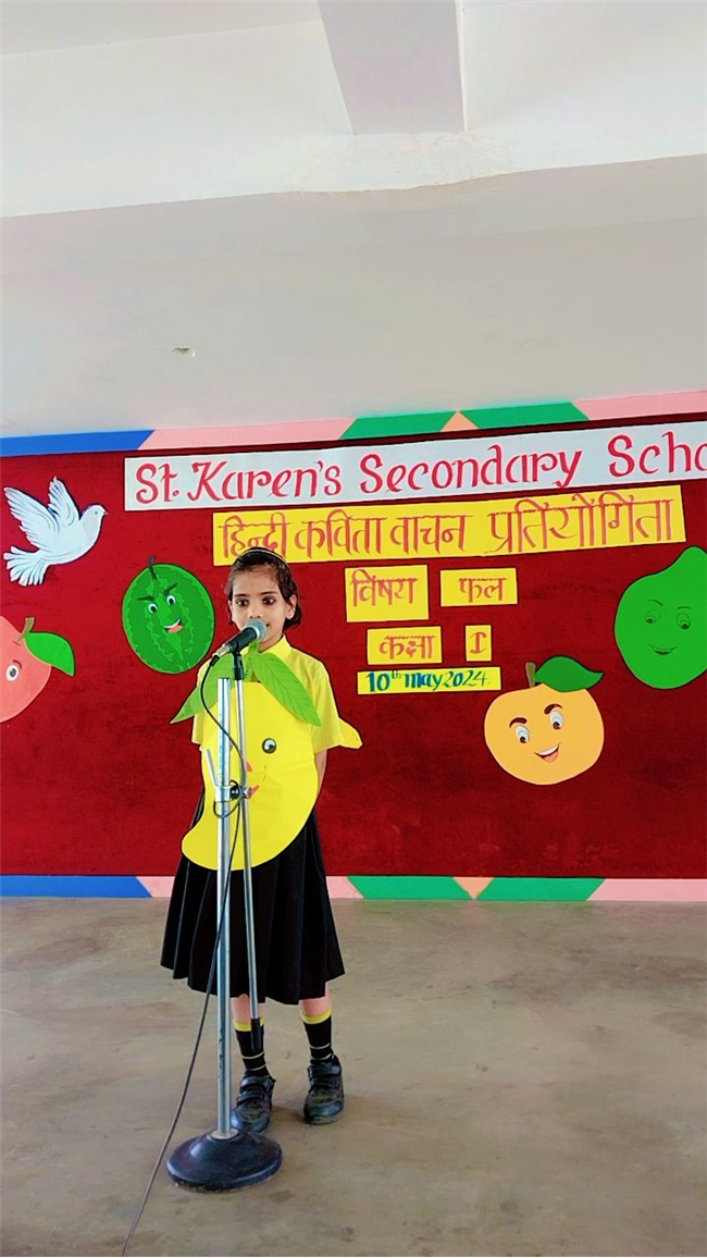 Description: Std 1,2 & 3 had ' HINDI KAVITA VACHAN PRATIYOGITA ' on the theme ' PHAL' . This inter class Competition was organised on 10th May '24 in Primary Assembly Area with great zeal and enthusiasm. All participants recited poems of their choices using their attractive and creative props of different fruits to enhance their presentation. It was really impressive.