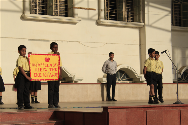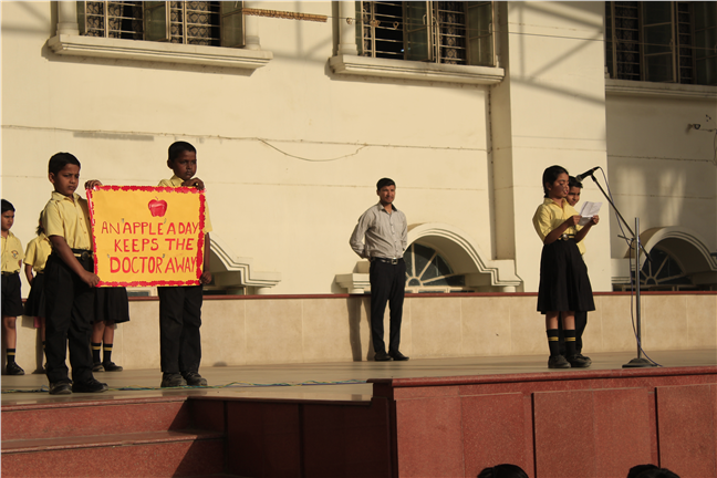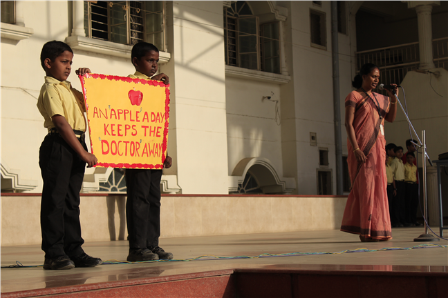 The morning sets the day and the assembly paves the way for our students to rejuvenate their spirits, remain rooted to the moral values and unleash their vitality to channelize their energy in a positive direction. Today's assembly was based on the topic: "IMPORTANCE OF AN APPLE".