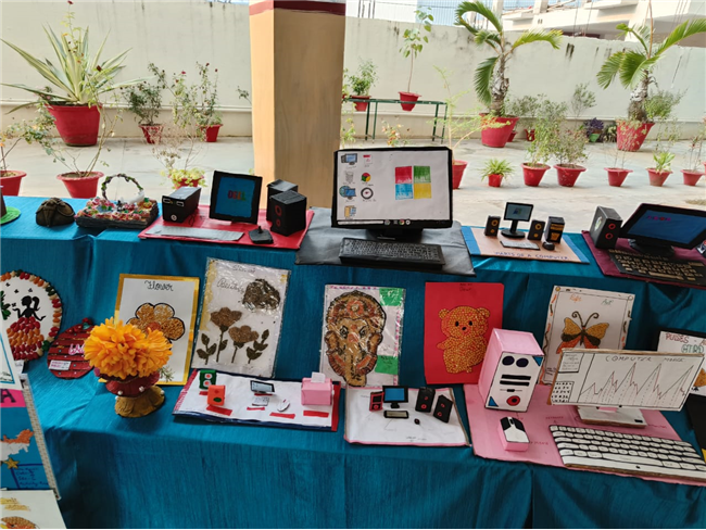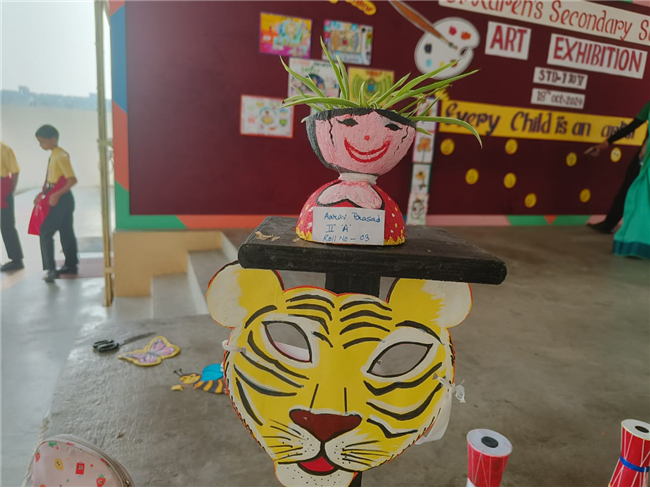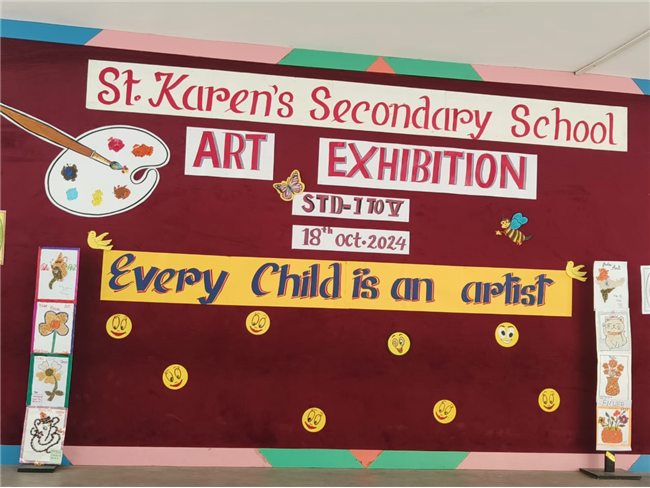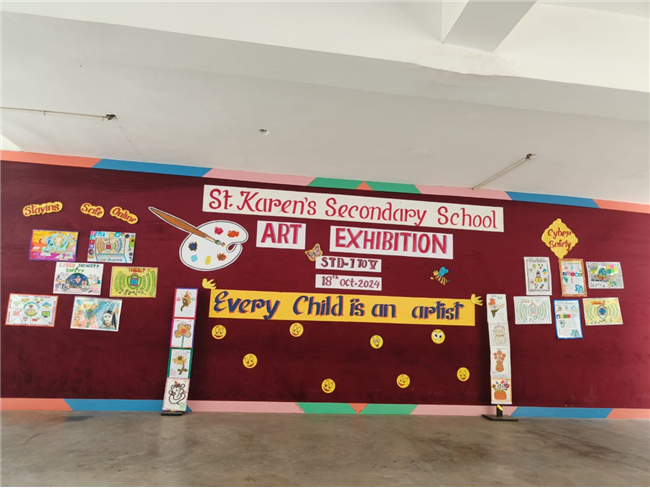 Description: St. Karen's Secondary School showcased its "Art Exhibition" and displayed the creative talents of students across Grade 1-5 levels on 18th Oct' 24 ( During 3rd PTM) The event was held in the Primary Assembly Area, which was transformed into a vibrant gallery space filled with artwork. Little artists explored their artistic skill and expressed themselves creatively . Love for Library was visualised through the display of 'My Recipe Book'. Moreover , there was a corner for Digital Exhibition in which Std-3 showcased " Models of Computer". Std-4 students focused on Cybersecurity Awareness with artistic expression on different posters. Std-5 showed PPT on " Festivals of India" which was displayed in Primary Multimedia Room.