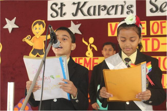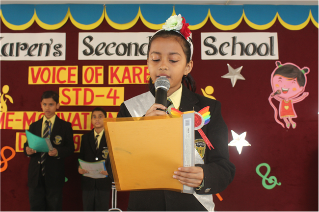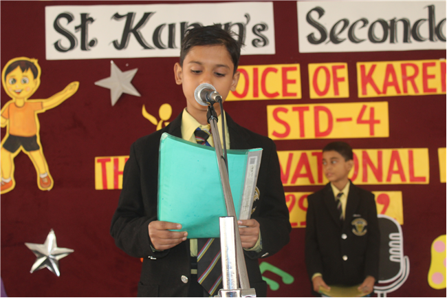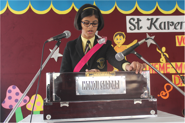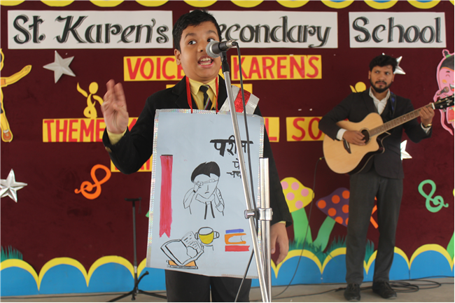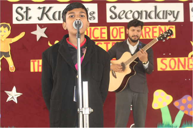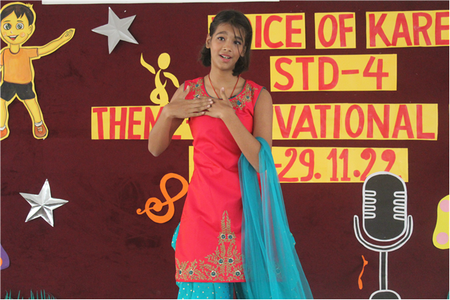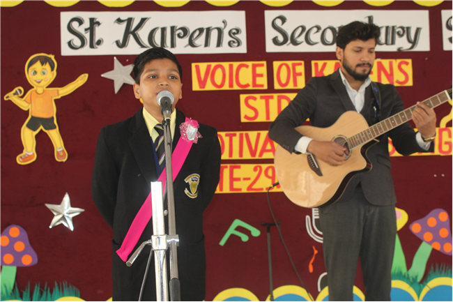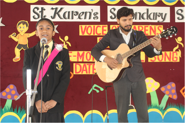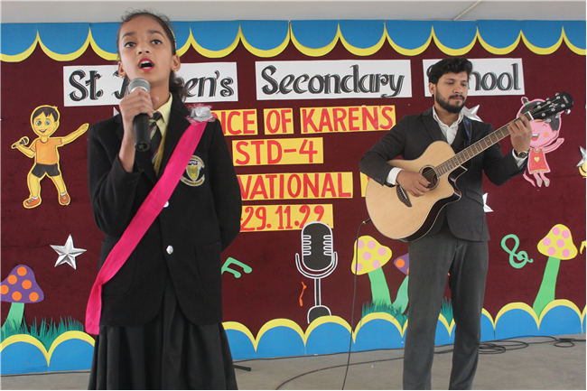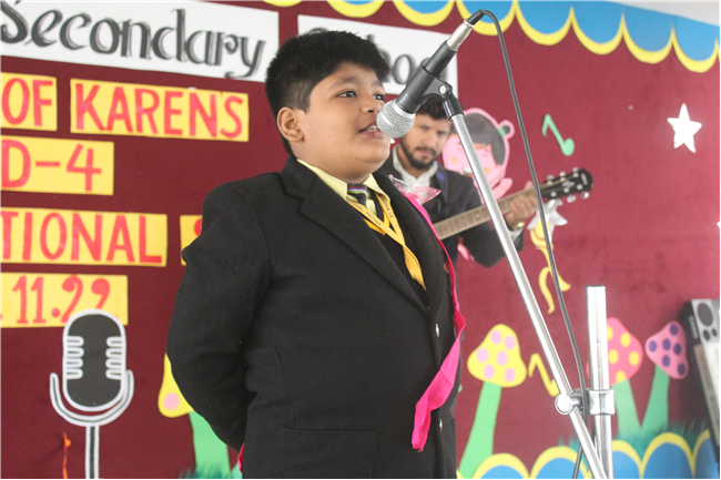 Description: Those who wish to sing always find a song”. To bring out the singing talent of the students a solo singing competition “VOICE OF KAREN’S “ was organized in the premises OF ST. Karen's Secondary School on 29th November 2022 for the students of class IV. The theme of the competition was motivational song. The competition started just after the morning assembly. 10 selected contestants (2 from each section) participated in the competition. The program started with a prayer dance. Anchoring was done by the students of class IV. There were six fillers which made the program more interesting and fascinating. All the participants sang the song with full confidence and passion. The melody of the song pulled the heartstrings of the audience. The winners were selected by three eminent judges. The winners were awarded with prizes and certificates by the judges. Overall the competition was well organized. The effort of the students and the faculty members is highly appreciable.