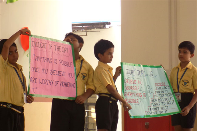 Description: The morning sets the day and the assembly paves the way for our students to rejuvenate their spirits, remain rooted in the moral values and unleash their vitality to channelize their energy in a positive direction. Today's assembly was based on the topic: "LIFE IS ABOUT MAKING AN IMPACT NOT MAKING AN INCOME" AND "ANYTHING IS POSSIBLE ONCE YOU BELIEVE YOU ARE WORTH OF ACHIEVING IT."