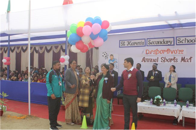 Desportivo '22 , Annual Sports Meet was celebrated at St. Karen's Secondary School,Patna on 17th December, 2022 with great zeal and enthusiasm. The event was inaugurated by the Chief Guest Ms. Suverna Sajwan, Commander at 40th Batallion. SSB, Patna. The occasion was flagged off by the prayer song crooned by the school choir group. The Plus Two Incharge addressed the audience with the welcome speech. The Chief Guest was felicitated by presenting a bouquet of flowers, a shawl and a school memento.